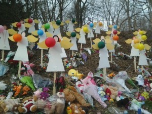 I implore you to look at the photo above. Really look at it. This is a roadside memorial for the young victims of the Newtown tragedy. As I drove through Sandy Hook and Newtown yesterday, I saw funerals at every church I passed. Mourners in black. I saw a funeral procession driving through a cemetery…a final resting place for someone who should have never died.