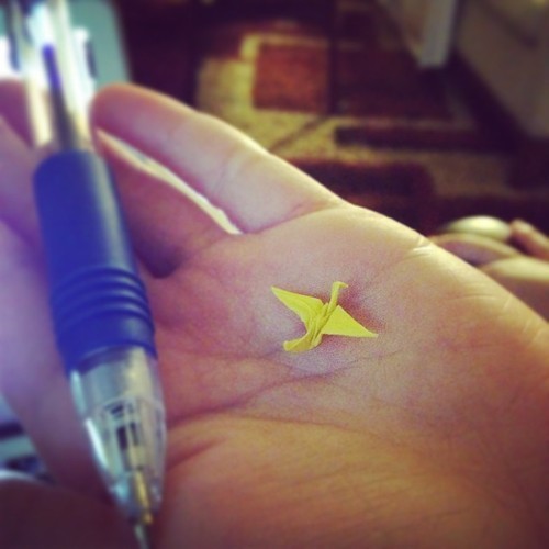 Teeny paper crane made by teeny hands. #origami #tiny...
