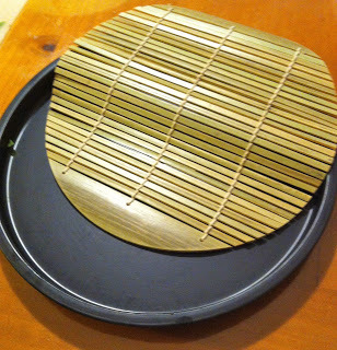 Actually, Zaru Soba is named for the zaru, a bamboo flat basket. It acts to drain the water from the noodles. We bought zaru dishes (at the Japanese version of the dollar store, no less), which are rimmed plates with a bamboo insert.