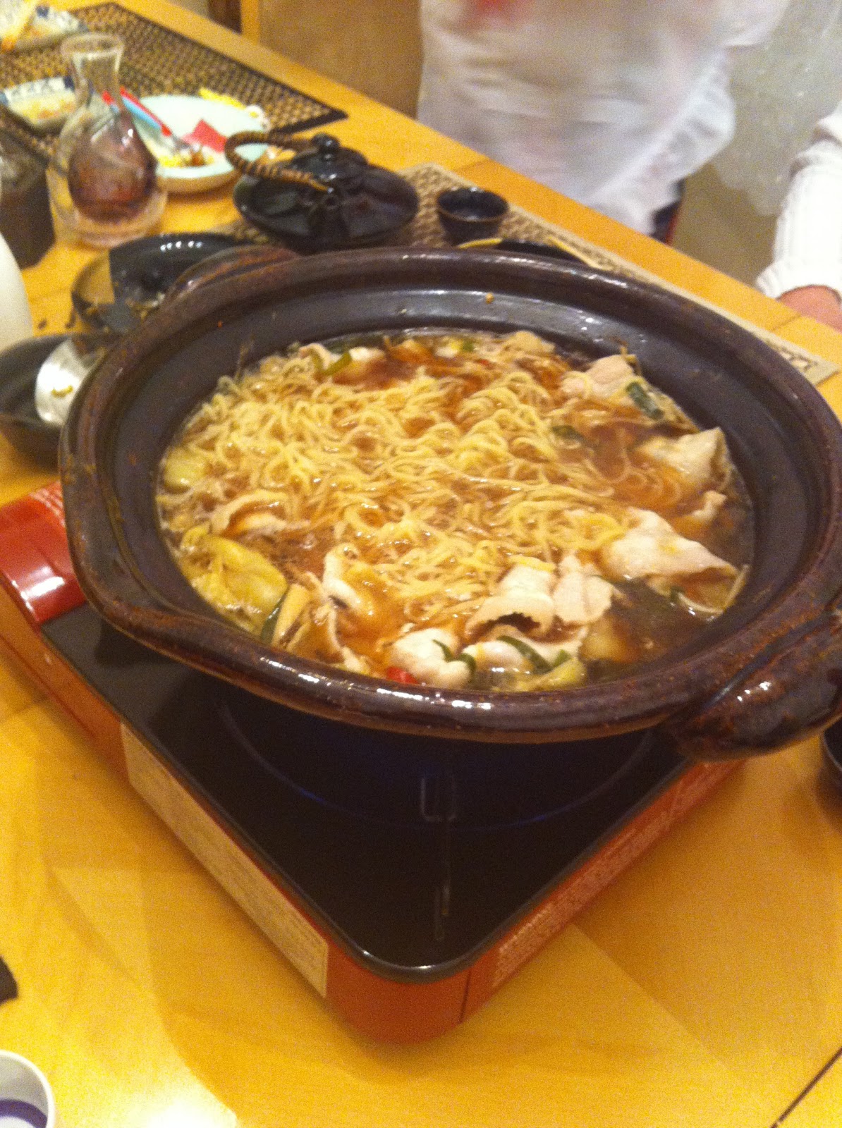 Cup O'Noodle people!After the pork and vegetables were gone, ramen noodles were added to the pot (our six year old left an engrossing movie to run to the table and steal my noodle bowl). By that time, high grade tequila and whiskey had arrived at the table. Hot sake still flowed. Bottles of water appeared. Ramen disappeared like magic.