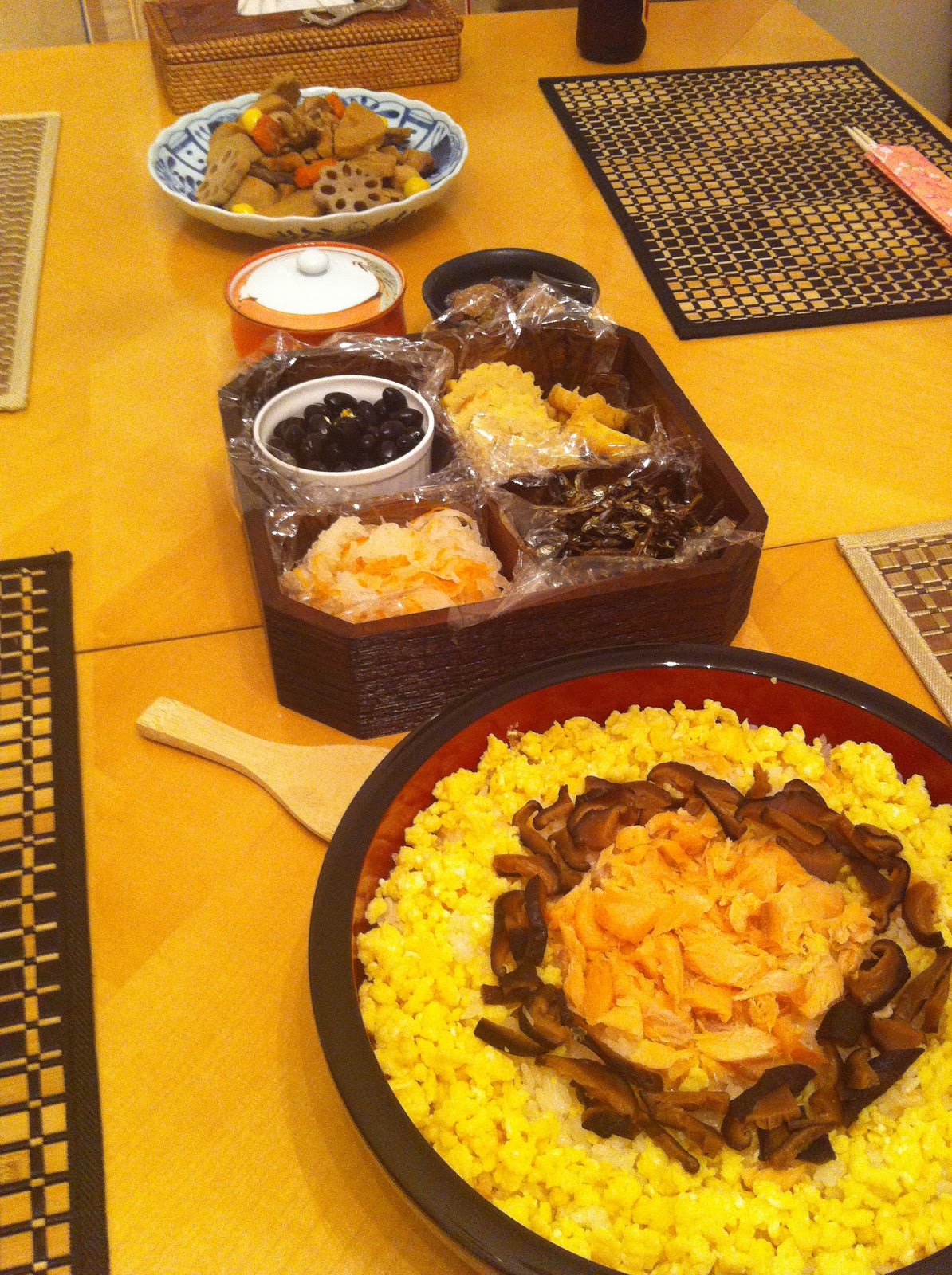 Osechi RyoriI was a little hesitant to try. In my experience, the more brown and plain the meal, the better it tastes. The more beautiful... Well, my eyes aren't eating, my mouth is. But I'm a culinary philistine. Osechi Ryori is pretty, colorful, and surprisingly delicious. Of course, all the dishes have symbolic meaning for good health, fortune, etc. in the New Year. None of the Japanese families gathered could remember which one meant what. And anyway, we all just wanted to eat and drink.On the menu (center in the picture): Kuromame, black beans simmered in soy sauce and sugar. Our hostess added gold flakes which drew my kids to the beans like magpies. Datemaki, are the yellow, ridged foods tucked in among the bowls. They taste like egg sushi, sweet and savory, and ours had shrimp in them. Really yummy. One bowl held sugared beans (sweet and dry at the same time). One bowl holds tiny roasted fish. Another holds a shredded daikon and carrot vinegar salad. The bowl with the dark brown food is a simmered salmon dish.