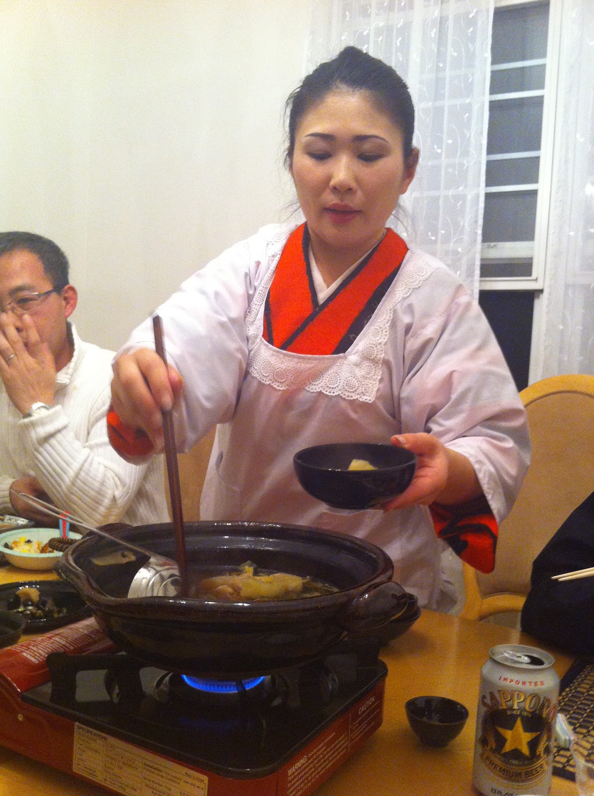 Sushi dishMoving down the table we also had simmered winter vegetables and a sushi (vinegared rice) dish topped with egg, hand smoked salmon, and simmered soy mushrooms. These were the first courses. We drank beer and ate and talked while our lovely hostess prepared the next course.I secretly unbuttoned my pants and accepted the first round of cold sake.