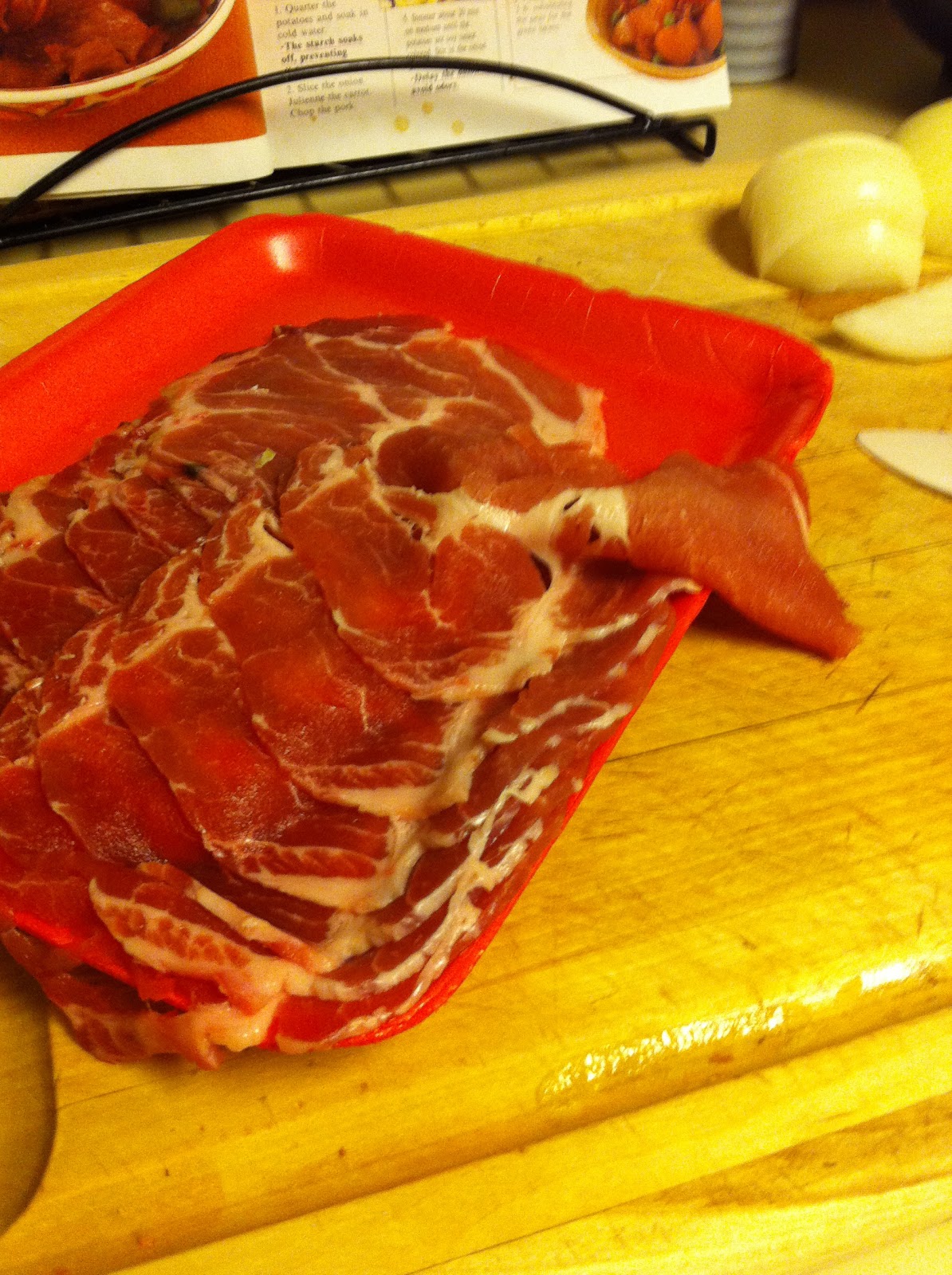 1/2 lb. (8 oz.) thinly sliced pork (you can find this in Asian stores or ask a butcher to slice some loin 1/16")