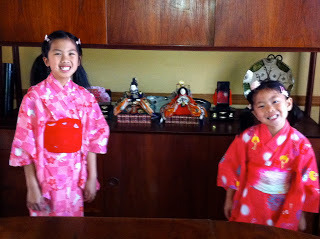 Our tiny Hina Ningyo courtMarch 3rd is Girl's Day or the Doll Festival, Hina Matsuri, another holiday my kids love (boys get their turn in May on Children's Day). In Japan, grandparents buy their newborn granddaughters Hina Ningyo, dolls that replicate the Emperor, Empress and court from the ancient Heian Period. These beautiful china and silk dolls are displayed on tiered steps covered in red cloth in a place of prominence. If Grandma and Grandpa are well coffered, or if you inherit a set, you might have a royal court complete with furniture, lights, and beautiful lacquer bento boxes.