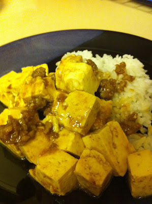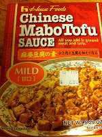 in the U.S.First, the Hamburger Helper way. Here's a picture of a package of Mabodofu mix. You can get them in Asian grocery stores at different heat levels. (Mild has absolutely no heat). This is super simple. All you need is about a quarter pound of ground pork, a package of tofu, and green onions (you can actually leave the green onions out). Make some rice, saute the pork, add the sauce and cubed tofu, and you are done. Aside from the rice, it takes about 10 minutes.
