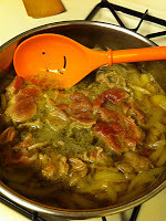5. There will be a lot of liquid. Serve the pork-potato mixture in the broth, but it's not soup, so use your own discretion on how much broth you want. Ladle into a bowl and scatter with the green beans.