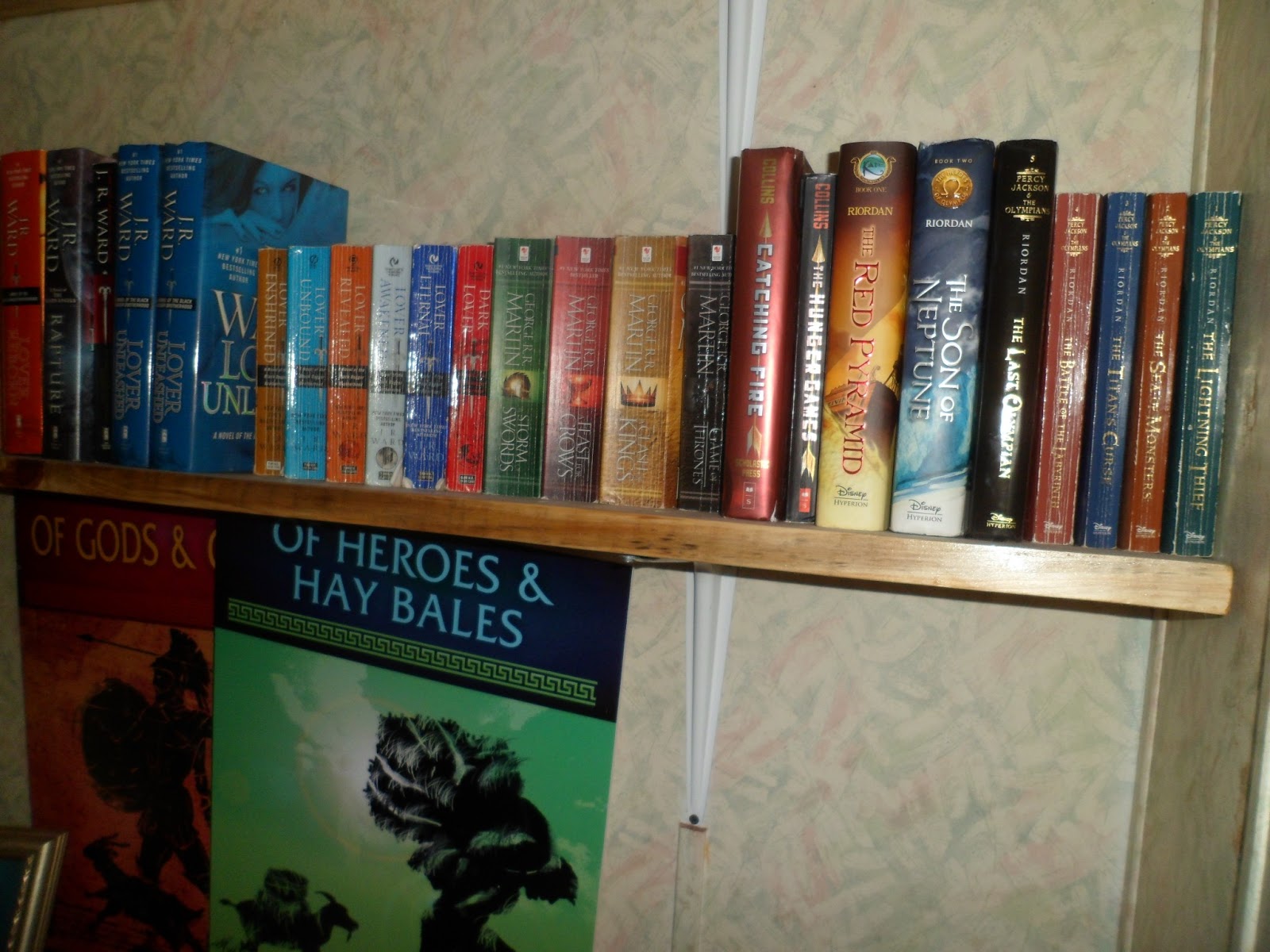 As you can see I don`t have a huge wall of books. Not that I wouldn`t love to, but living in a single-wide trailer, space is at a premium. Mister built me these shelves and I just adore them! Down below the books are the table-toppers for my own books. Pretty snazzy, huh?