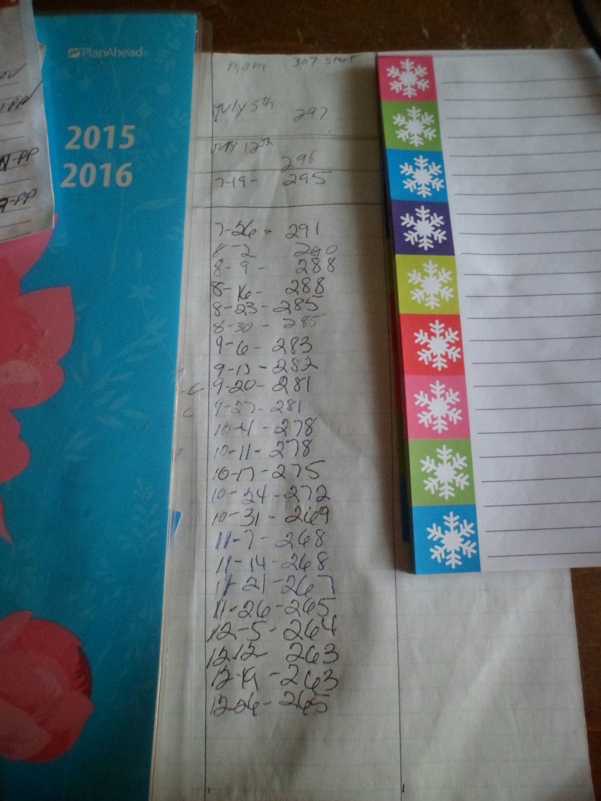 Today I will flip it over and start jotting down my weekly results for 2016. As you can see, some weeks are good and some are not. I did gain a couple pounds over the holidays, and that's okay. I suspected I would. I try to stay away from saying "I am going to lose XXX by XXX date!" because if I don't, I'll feel like a loser. Bad energy breeds more bad energy and the self-hate will make more self-hate because I didn't make that darn numerical goal. Before you know it you've sunk into a pit and have no will to crawl out.