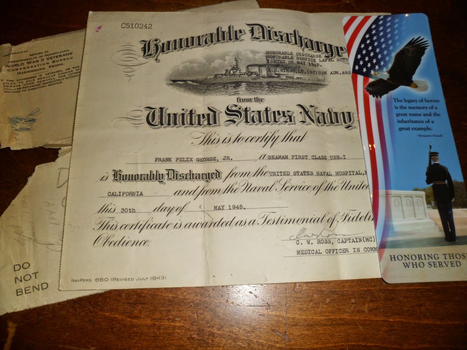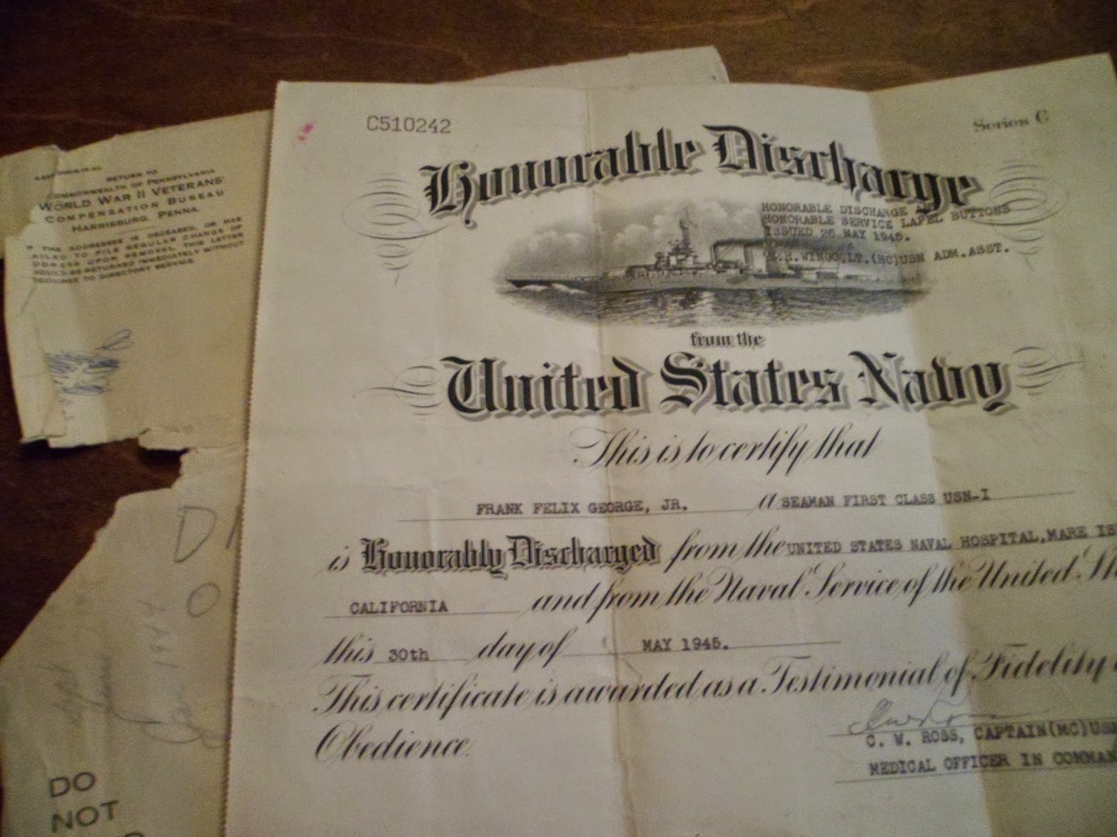 I was lucky enough to have a wonderful Navy veteran in my life. Pop just passed away on November 12th, and while going through his papers I found something that I thought would be interesting to share during our hop. Imagine my surprise to find my father`s original discharge papers!