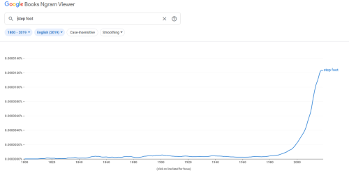 From time to time I point out annoying trends in language. My bugaboo today is the phrase “step foot.” This term has only become common recently. See the graph from Google N-grams below. It’s only in the last 20 years or so that it’s been popular.