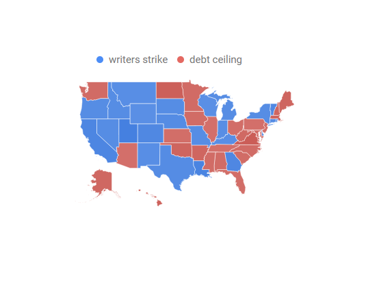 Interesting search trend in Google. As one might expect, the debt ceiling is searched more in the D.C. area and the screen writers’ strike is searched more in California and New York. But outside those areas, it seems that the topics are of similar importance, but there is still some regionality shown.
