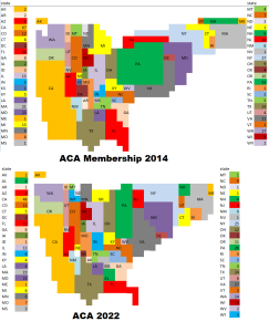 I’m a member and past president of the American Cryptogram Association. I joined back in the 1970s. It’s my main hobby. The membership numbers have steadily declined since the digital age began. Here is a graphic representation of ACA member counts state by state in 2014 and 2022. The graphs are to scale with the numeric counts shown on the sides.