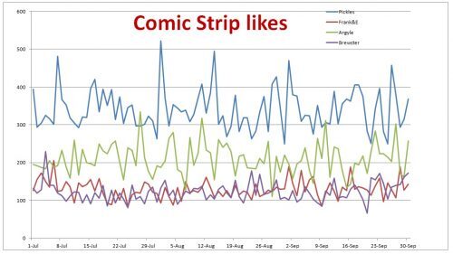 I chose four relatively popular strips that are humor oriented and recorded how many likes each got from readers over a three month period (July through September 2021). The four strips are Pickles, Frank and Ernest, The Argyle Sweater, and Brewster Rockit. Here’s a chart of the raw data:
