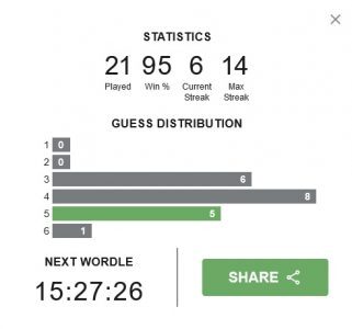 Okay, with a blog titled OnWords, you knew I’d have to get around to the latest online word craze, Wordle. It’s essentially MasterMind using five-letter words. It’s fun and I’m hooked. You should try it. Here are my stats: