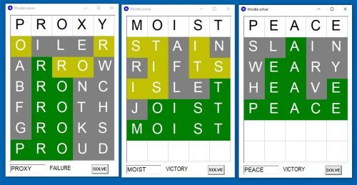 This will be my last post on the subject of Wordle for a while (I hope). I wrote a program that tries to guess the input Wordle word. I’m calling it Worbot. I wrote it so that its attempts are shown in the same format as the actual Wordle. The program doesn’t have access to the Internet, so it can only solve the word that is input. It does a pretty good job of it. The only word Wordbot hasn’t solved in six tries (the maximum allowed by actual Wordle) is PROXY, which is also the only word I didn’t get in six tries. And I had to run the word PROXY three times before the program failed. It rarely fails to solve within four guesses. Here are some sample runs. Spoiler warning: one of the words shown is today’s actual Wordle word, but you probably won’t read this today.