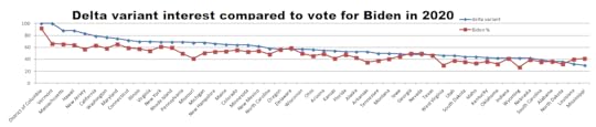 The graph below shows the relative interest in the Delta variant of the Covid-19 virus over the second week of June compared to how each state or district voted in the 2020 presidential election. Click on the image to pop it out and enlarge it for better viewing.
