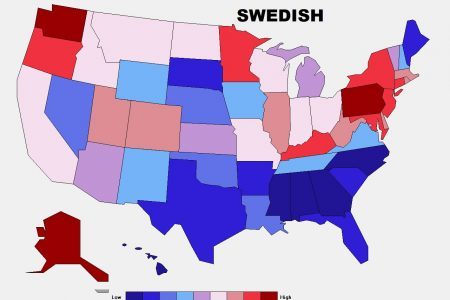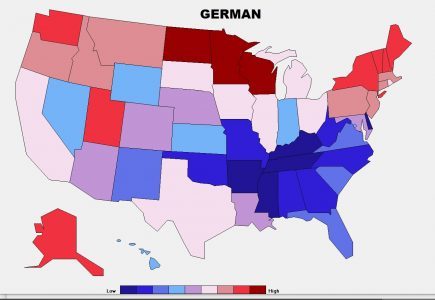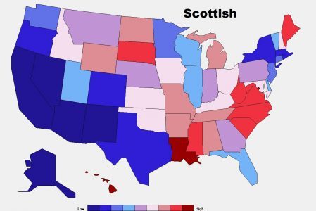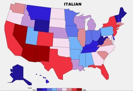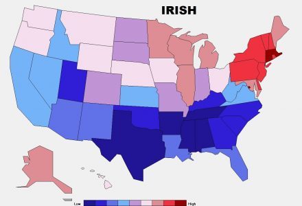 In each of these The darker red indicates the highest density of people with that heritage, blue the lowest density. The data is taken from U.S. Census data from 1910 – 2018 so it shows long-term trends. I chose 20 names that are common to each of the nationalities shown and not common in other groups and measured what percentage of the total names in that state they represented. Note that Germans, from a more northern, colder, country tended to settle in northern parts of the U.S. while Italians flocked to the hot weather states. The Irish, no surprise, are densest around Boston and vicinity. I doubt climate had much to do with that; both are heavy fishing communities, which is a more likely explanation. Here are some more examples: