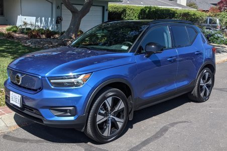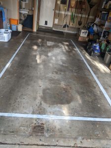 My garage was wired for a Blink EVSE back in 2011 for my new Nissan Leaf. The Blink was on the right side which was fine for the Leaf and much easier to install because of the workbench and washer/dryer on the left. Now with the 240V socket on the wrong side for Volvo, I have to back in to charge. Technically I can do it when facing forward if I pull in way on the right side, but only at risk of scratching up the paint on the roof of the car dragging the heavy cable over the top. The problem is that it’s a tight fit – the car in the garage, that is. If I pull in too far, I cut off access from the house to the wash/dryer workbench area where I get out of the car and if not far enough the garage door will come down on the car. Also, there’s lots of stuff on both sides that causes the warning system to sound alarms at me as I back in, and visibility isn’t good coming from the bright sun to the dark garage, especially with sunglasses on. My solution was to paint stripes on the floor of the garage so that the camera system recognizes the stripes and stops screaming at me as I back in. I’ve tested it pulling in forward and the bird’s-eye view camera system sees it perfectly and I can place the car perfectly. I haven’t tried it backing in yet, but if nothing else, it will make it easier for me to judge my positioning. I don’t expect others will need to do it, but I’m rather proud I thought of it. My butt is still sore from all the squatting. I used masking tape, spray paint, and a sort of stencil made from a cardboard box.