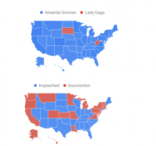 For those who are out of touch, Amanda Gorman is the Youth Poet Laureate for America and recited a poem at Biden’s inaugural. She is black. Lady Gaga is a white singer and certainly better known than Gorman prior to January 20th. As for the second map, it seems almost reversed from the electoral map, with blue states colored red and vice versa, although of course there are exceptions. It seems Democrat-dominated states are more concerned with the insurrection while the Republican ones are more concerned with Trump’s impeachment.