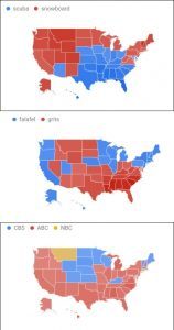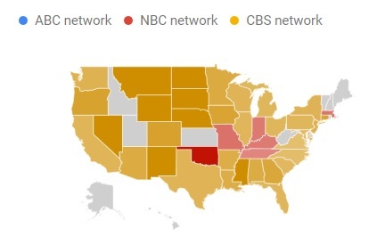 The middle one, falafel/grits is rather interesting and surpising to me, but I’ll let you draw your own conclusions from it. I’m not sure why the distribution on the three mainstream TV channels, but it’s probably unfair. The term ABC is common for other uses while the others are not, so the overwhelming red may be misleading. In fact if you add the term “network” after each, you get very different results. See below. Then there’s issue as to whether you’re thinking of news, sports, or regular programming,