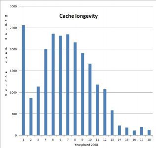 I examined all of my finds (from GSAK) that have been archived, excluding events, CITOs and other event-type caches. The chart shows the median number of days between placement of the cache and the final log, which was normally the archive log.