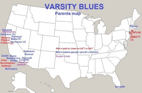 For those of you who don’t follow the news, Varsity Blues is the FBI code name for a widespread cheating scandal and conspiracy where rich parents paid others either to arrange admission of their children into preferred universities or to take or modify ACT or SAT tests for their children. So far 33 parents and another 17 people (e.g. coaches, test-takers) have been charged federally with fraud or conspiracy. So far ten parents have pled guilty and another four are expected to plead either 5/24/19 or 6/21/19. The other parents have all been indicted and are facing trial unless a plea agreement is reached. The map below shows names and locations of the parents.