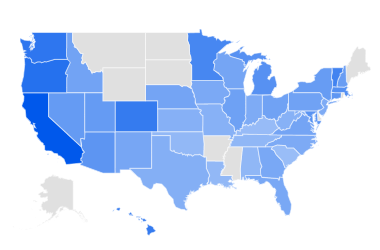 These charts represent the number of searches of the listed terms within the last 12 months by state, according to Google Trends. The top one shows that the term Humvee was searched more than PHEV in all but three states. The darker the red, the greater the imbalance. The bottom map shows the highest percentage of searches of the term PHEV without regard to any other terms. For those unfamiliar with cars, a Humvee is a monster of a quasi-military style vehicle, while PHEV stands for Plug-in Hybrid Electric Vehicle.