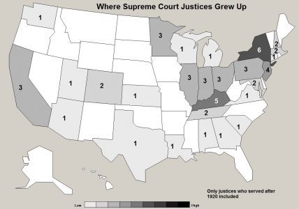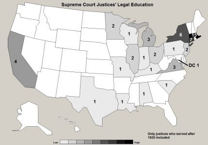 Of course the judicial branch is not supposed to be subject to the vagaries and political pressures of the election process, but it is still arguable that the entire country’s legal system ought not to be ruled by an elite few with a restricted, insular view of such values. Therefore I researched where every Supreme Court justice grew up and where they received their legal education. I limited my review to those who served within the last 100 years, after the “lower 48” were all states. Consider these maps: