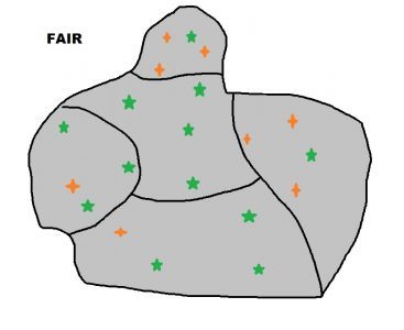 There are two safe districts for Green in the middle, but the other three districts are split 50-50. They could go either way. The district lines appear to be rational from a geographic standpoint. A court would probably consider this fair even though it might result in Green representatives in all five districts or three being Orange. However, suppose the two purplish districts are currently represented by popular Orange incumbents who consider their seats safe. The Orange party, if they’re lucky enough to be in control, might like this one better than the first (fair) one above, assuming the incumbents aren’t worried about the 50-50 split in their districts. This way they have a 50-50 chance at picking up a third Orange seat. In real life it is quite possible, and has often happened, that a minority party can retain, even guarantee, control in its state.