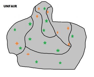 See how that almost certainly gives Green four of the five seats since they have a 3-to-1 voter ratio in four. Notice also that the districts have odd shapes. This is where the term gerrymandering comes from – districts drawn this way are said to resemble salamanders. Courts often strike these down and have been known to appoint their own committees or special masters to redraw the lines more fairly.