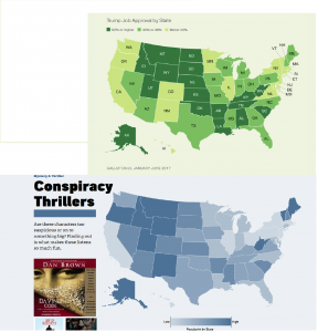 Interestingly, I recently compared two maps of the U.S. on a state-by-state basis. One is the popularity of conspiracy thrillers like Dan Brown’s books (map provided by Audible.com) and one of Donal Trump’s approval rating (Gallup). Although not identical, they are strikingly similar, i.e. people who like conspiracy books like the Donald. Make of it what you will.