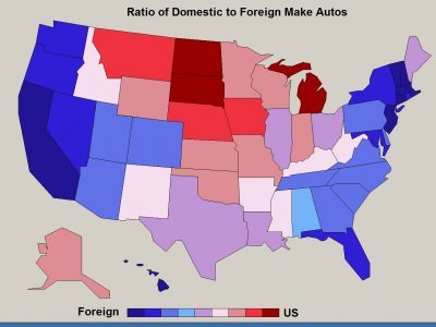 Consider the following chart showing the relative ownership of domestic makes of cars to foreign makes by state.