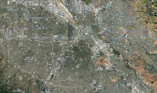 Second, Fords and Hondas cluster around the east side of the valley, Dodges and Jeeps in the central area near downtown. This may be coincidence or perhaps it has to do with dealerships. Most notable, though, to me is the high number in East San Jose on city streets, not freeways. This coincides with crime reports. That area tends to have a lot of bars and violent incidents involving drinking or drugs, although I don’t have hard numbers on that. For those not familiar with the area, the hills to the west are the more expensive areas to live, the east side more working class, although homes get more expensive again up in the eastern hills.