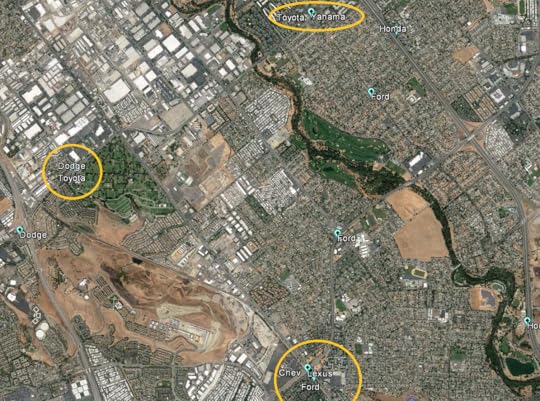 I was also surprised at how many were solo crashes, especially in East San Jose. I suspect drunk driving was involved in a lot of those. You can see some data points with two car makes listed next to them, but they are hard to spot. I created a KML file and loaded it into Google Earth for this. It was an interesting technical exercise, and if you want to know how to do it, contact me using the contact link above. This file allows the user to zoom in on Google Earth and see the crash marker in more detail. Sometimes more vehicles pop out that way. See the image below; I circled a few examples. I only loaded car makes into the data file, but it is possible to include other data in the KML file as long as it can be represented in an Excel file. For example, it might be interested to show this data marked with time of day.