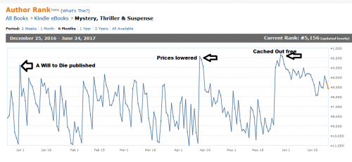 Those of you who are self-published or are thinking of self-publishing may find this author rank chart interesting. It shows how well (or badly) various events affect sales. This six months chart shows the sales performance of all my books combined (7 Cliff Knowles mysteries). The comparison is to all Kindle ebooks in the Mysteries and Thrillers categories, both self-published and major publishing house titles. I don’t know how many authors there are in that category, but I know it’s over 100,000. It’s possible to break down the mystery category farther into Police Procedurals, etc., and of course my rank gets higher in the smaller categories because there are fewer books, but the overall trend is about the same.