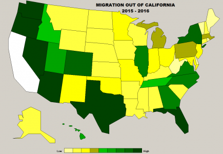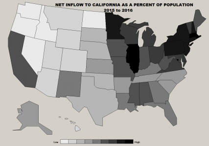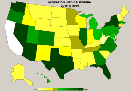 This map shows a net migration into or out of California as a percent of the population of the other state. I set California at zero for comparison purposes even though it had a net outflow. Every state that is darker than California had a net migration into California with the darkest having the highest percent of their population migrating. Everything that is lighter than California shows a net migration from California to that state with the lightest receiving the biggest bump to their population as a percent. The top maps show raw numbers while this bottom map shows the biggest effect on population percentage-wise. It seems there is still a westward migration going on, especially from the Northeast. It also appears that Californians are moving to adjacent states, probably in many cases motivated by the high housing, taxes, and other costs. There was a net flow of about 14,000 to Nevada, 9,000 to Oregon and a net inflow of almost 6,000 from New York to California. Bear in mind that the IRS data does not show movement of those who don’t pay federal income taxes, like the poor, unless they are taken as dependents on someone’s return. It also doesn’t show movement to or from foreign countries. Even so, it seems reasonable to assume that these trends are consistent with population movement as a whole.