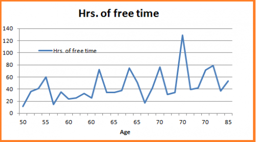 I’m still analyzing the data on retiree free time from my survey. The chart below shows a generally upward trend in the amount of free time as one ages. This is unsurprising, but what may be surprising is the degree of variation. The numbers on the left show the reported number of hours of free time per week of the respondents, or, more precisely, hours that fit into the nine broad categories I listed. I still think there are substantial free time activities not reported in the survey.