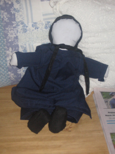 On the way back to the gift shop I asked the guy who was driving our wagon about the dolls and he told me that there was one in the gift shop. (Well, I knew that!) but settled myself into getting the doll from the store. Actually there were two dolls in the store–one boy and one girl. Buy only the girl doll had a tag that said Amish made. I snatched her up and took her to the counter to purchase. I told the lady that I was disappointed that none of the farms offered dolls for sale. As she rang up my purchase she asked me if I remembered the first farm that we had stopped at on the wagon tour. “Of course,” I said. Then she proceeded to tell me that the doll I was purchasing was made by the woman who lived there, Amanda Swartzentruber. Furthermore, Amanda used to make several dolls to sell in the store, but their bishop decided that it shouldn’t be allowed. I bought the last doll that Amanda had made for them.