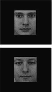 Here's how it worked: At first, subjects' arms were singed repeatedly with high or low heat pain, while viewing one of two faces (shown below). The subjects were asked to rate each burning pain from 0 to 100. The mean high heat score was 63, while the mean low heat score was 24.