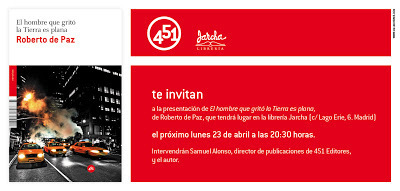 El próximo lunes 23 de abril, dentro de la madrileña Noche de los Libros, presentaré El hombre que gritó la Tierra es plana en la librería Jarcha. Al parecer también actuará "dosinblues". Estáis todos invitados. Os espero.