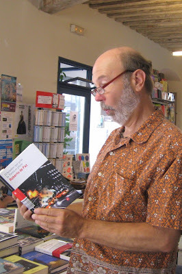 Aquí mi amigo Dave de San Francisco, la persona con las mejores camisas del mundo, gozando con "El Hombre que gritó la Tierra es plana" a pesar de no entender una palabra. Todavía no sabía que un personaje de la novela estaba ligeramente inspirado en él.