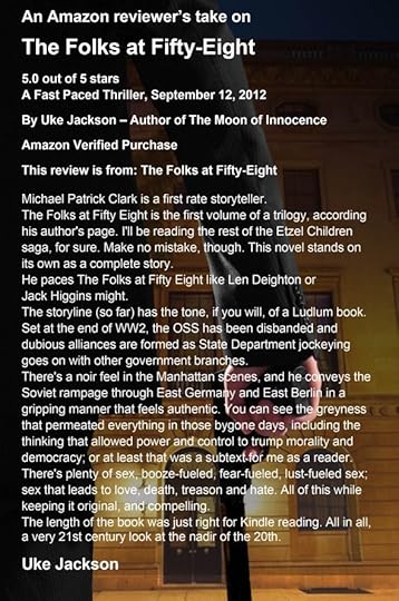 (4.3 stars, 24 reviews). Before we get to the interview a brief book description: Gerald Hammond is the exception to the rule; an honourable spy, whose lofty principles have brought him nothing but loneliness and isolation. Catherine Schmidt is the stunning young daughter of an assassinated spymaster, whose murderous quest for vengeance has left her at the mercy of the infamous Head of Soviet State Security. On a covert operation, in Soviet-occupied Germany, Hammond has no knowledge of the unseen forces that sponsor and oppose his mission. He only knows that he must somehow save her to save himself, but, as ever-more disturbing revelations come to light, begins to wonder which poses the greater threat; the enemy he runs from, or the friend he runs to? Set against a factual background of government conspiracy, and one of the most audacious espionage coups in history, the Folks at Fifty-Eight is a beautifully-paced tale of seduction, betrayal, blackmail, and murder that blurs the boundaries between fact and fiction.Author Interview with Michael Patrick Clark