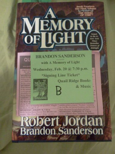 Here's a couple pics I'd posted to Facebook. The first represents two major events for me. First, it represents the conclusion to a series I've been reading for about a decade and a half: The Wheel of Time. Second, it represents that I'm going to meet not only my favorite author, but one of my biggest influences in writing: Brandon Sanderson.