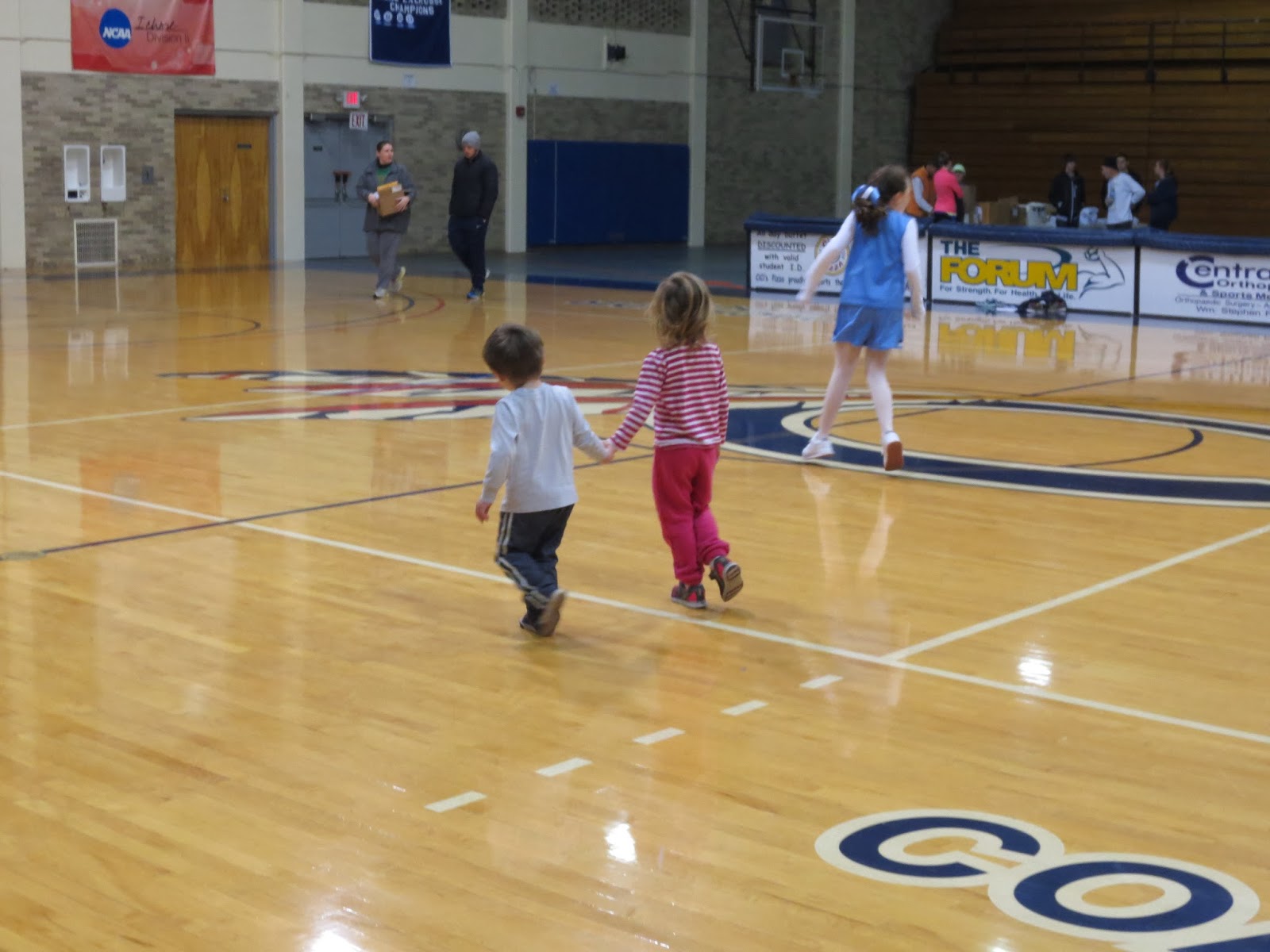 And finally, here's my son as a 3-year-old ladies man. He fell in the gym at the college where the race was held while playing and did his whole cover-my-face-and-pretend-no-one-can-see-me embarrassment thing. Then this little girl helped him up. And then he fell again, this time without the embarrassment, and she helped him up again. And then he fell while standing in place, obviously on purpose, smiling up at this girl the entire time. When she helped him up again, they held hands and proceeded to run around the gym together. Apparently I've got a little heart-breaker in the making.