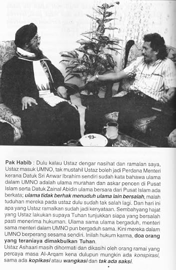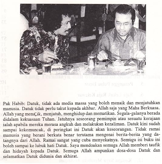 “Perihal adanya raja-raja, anak-anak raja, menantu raja, besan raja, biras dan sebagainya yang minum arak, kaki betina, kaki judi, kaki disko, yang perangai macam kaki busuk dan bermacam-macam kaki tidak pernah mendapat ruang di dalam akhbar-akhbar. Macam mana Raja nak tahu salah dan silap dan kerabat mereka.” (muka surat 232).Bab yang saya suka baca dalam buku ini ‘Tepuk Dada Tanya Selera Siapa Derhaka’ di muka surat 395 -406. Di sini terdapat satu pendedahan dari Pak Habib;
