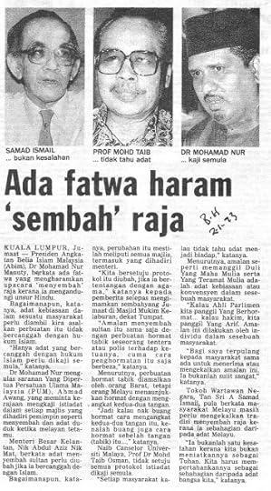 Orang kita takut tubuh bersentuhan Raja atau Raja di didik yang rakyat itu seperti kucing kurap, anak anjing, ‘patik’ yang tidak layak bersentuhan dengan Duli Yang Maha Mulia Paduka Raja.Raja kita ini ‘alien’ ke, atau ada penyakit yang tidak boleh bersentuhan dengan manusia biasa?Bayangkan safterputus dalam masjid waktu solat Jumaat.Tidak ada siapa yang berani tegur dalam khutbah.Sesungguhnya Kami telah mengutus seorang Rasul kepada kamu, yang menjadi saksi terhadapmu, sebagaimana Kami telah mengutus seorang Rasul kepada Firaun.Namun Firaun mendurhakai Rasul itu, lalu Kami siksa dia dengan siksaan yang berat.