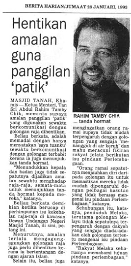 Nasib baik tidak macam anak anjing; patik yang bermaksud anak anjing di dalam bahasa Sanskrit, seperti bahasa patik pacal yang hina yang digunakan bila menghadap Sultan bermula dengan “Ampun Tuanku, beribu-ribu ampun, sembah patik harap diampun.” Dengan Tuhan pun tidak minta ampun macam tu. Dosa yang paling besar yang tidak boleh terampun ialah menduakan Tuhan.“ Tidak Ku jadikan Jin dan Insan melainkan untuk menyembah Ku. ”Al-Quran