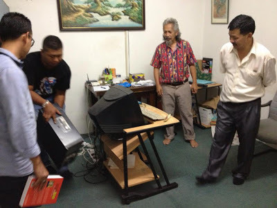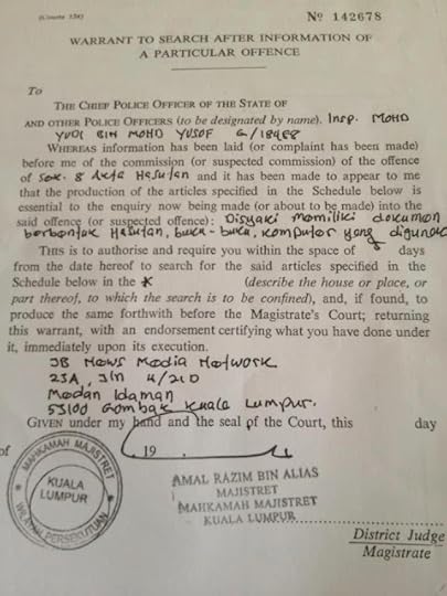 Chua kata dia ada ‘search warrant’ untuk menggeladah pejabat saya, dia beri saya sekeping kertas yang sudah di ‘fotokopi’ tapi tidak boleh di baca. Saya minta supaya boleh saya simpan untuk bahan bukti jika saya dihadapkan ke mahkamah.
