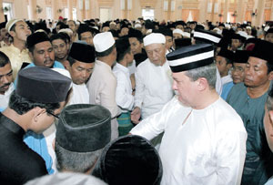 Kalau datang lambat macam mana pun mesti duduk dibarisan hadapan dengan pengawal peribadi; bayangkan di dalam Baitullah pun takut mati.Sahabat dan menantu Rasulullah SAW, Ali Bin Abi Talib r.a mati dibunuh sewaktu nak menunaikan Solat Subuh di masjid; itu semua ketentuan Allah. Malah mantan Presiden Amerika Syarikat, John F. Kennedy yang banyak pengawal peribadi pun mati dibunuh juga. Menyediakan permaidani istimewa, sejadah istimewa, tempat yang istimewa - ini perbuatan terkeluar dari akidah Islam namun tidak ada sesiapa yang berani bersuara.Sengal betul ulama poyo kita hari ini; belajar tinggi-tinggi, mengaji, tapi tidak mengkaji.Sepatutnya siapa datang lambat duduk di belakang.berapa ramai Imam yang berani suruh makmum rapatkan saf dengan raja? Semuanya diperhatikan oleh dunia kerana Solat Jumaat ada siaran langsung.