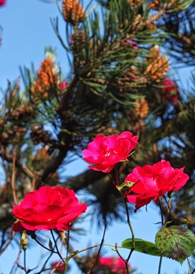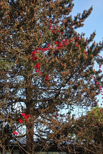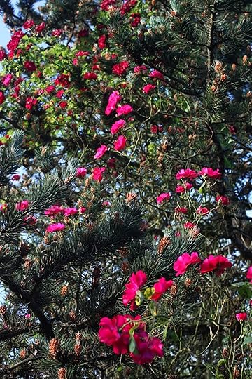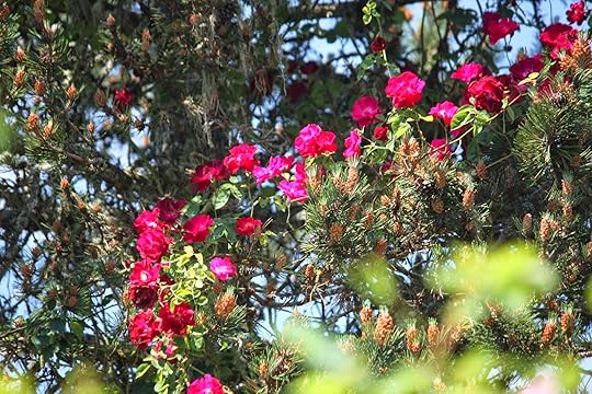 Once upon a time we had a tea rose outside our bedroom window with a coastal type pine behind it. One freeze saw the apparent end of the tea rose, but the hardier root stalk came up with something new-- a red climbing rose. So we let it go. One year we realized it was climbing into the pine tree above it. We have let it be and this year it is nearly to the top of that 30' pine. They look so gorgeous together, so unexpected. Sometimes the unexpected is the blessing.